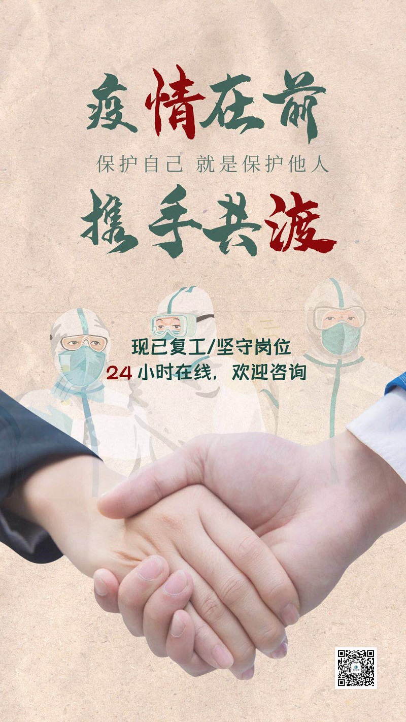 你好!鑒于疫情的影響,為保護員工生命安全,經(jīng)政府相關(guān)部門要求和公司研究決定:我司重要部門于2月24日正式開工,部分員工和區(qū)域分公司(辦事處)復工時間以當?shù)卣?guī)定時間為準。同時為了做好客戶服務(wù)工作,我們啟動了遠程客戶服務(wù)響應機制,服務(wù)方式以QQ、微信、電話、視頻會議等為主。