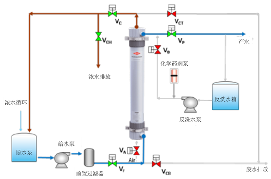 當(dāng)超濾進水懸浮物含量較低時,超濾可按照濃水排放過濾模式來操作。進水進入超濾膜組件,以較低比例的濃水量排出膜組件,通常 5~10%的進水量,大部分的進水透過膜表面成為產(chǎn)水產(chǎn)出。