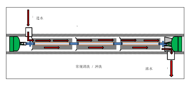 常見的反滲透的沖洗設(shè)計一般是從壓力容器進水端流入,經(jīng)過膜元件后從壓力容器濃水端流出,這個流向與反滲透系統(tǒng)正常運行時是一樣的。反滲透的反向沖洗指的是由濃水端向進水端方向進行沖洗的過程, 反向沖洗有助于去除反滲透系統(tǒng)的前端污染物,采用此方法進行沖洗反滲透膜元件受到的污染更??;當(dāng)有顆粒物(細(xì)砂、活性炭)時,必須采用此方法,以免反滲透膜表面被劃傷。需要注意的是任何時候嚴(yán)禁由產(chǎn)水端向進水端進行沖洗,這會造成反滲透膜元件背壓,使反滲透膜元件受到不可逆轉(zhuǎn)的損害。