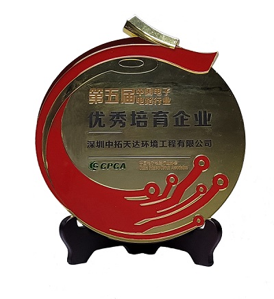會議期間,向被評選為第五屆中國電子電路行業(yè)優(yōu)秀企業(yè)頒發(fā)獎牌和證書,深圳中拓天達環(huán)境工程有限公司榮獲“優(yōu)秀培育企業(yè)”。